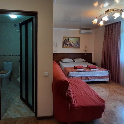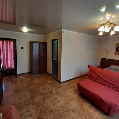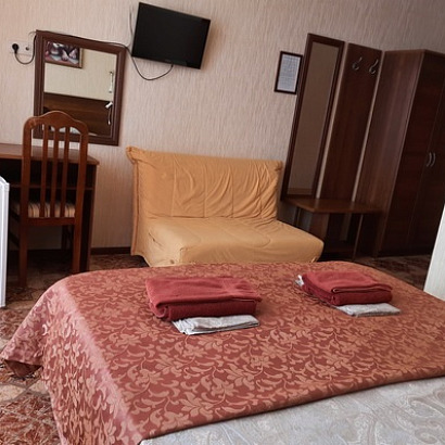 Все номера оборудованы мебелью: 2-х спальная и/или 1-но спальные кровати, диван-кровать, стол, шкаф, прикроватные тумбочки, зеркало. Полотенца предоставляются 2 шт/чел (смена по запросу), уборка номеров каждые 5 дней. Дополнительное место диван-кровать.