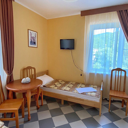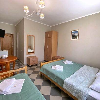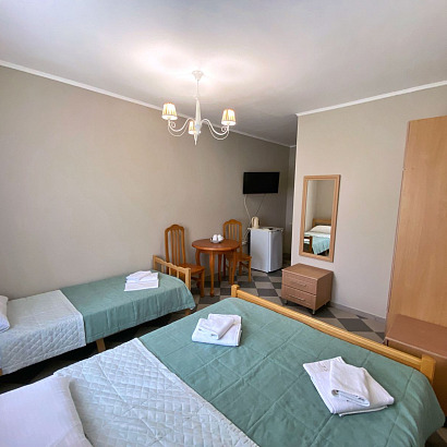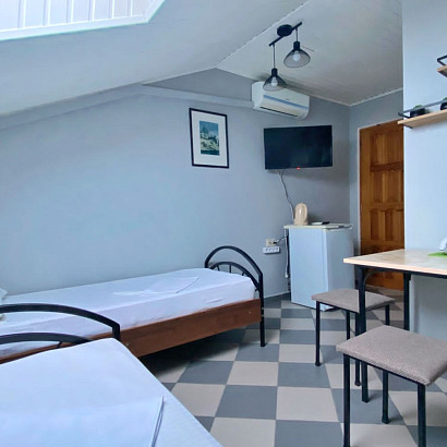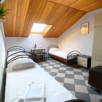 3-местные мансардные номера со всеми удобствами (душ, туалет, умывальник, телевизор, холодильник, сплит-система, электрочайник, набор посуды). Номера расположены на третьем этаже. В каждом номере раздельные кровати. Возможна установка дополнительного места (раскладная кровать с ортопедическим матрасом).