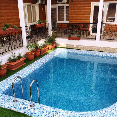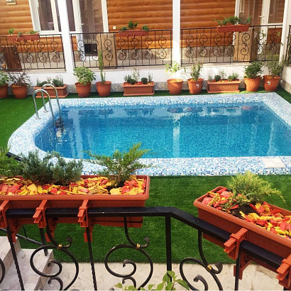К услугам отдыхающих: уютный закрытый двор, детская площадка, бассейн с подогревом (5х3,5 метров, глубина 1,6 метра), бесплатный Wi-Fi на территории, места для отдыха с мангалом (пользование может быть ограниченно в связи с действием Правил пожарной безопасности), гладильная доска и утюг, фен по запросу, стиральная машина за доп. плату ≈ 200 руб. загрузка, сауна за доп.плату ≈ 700 руб./час.