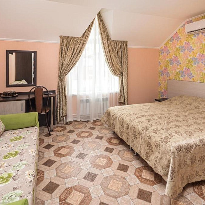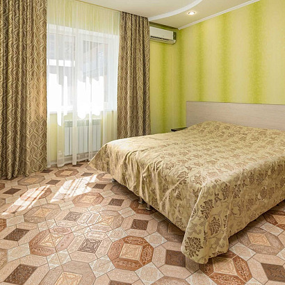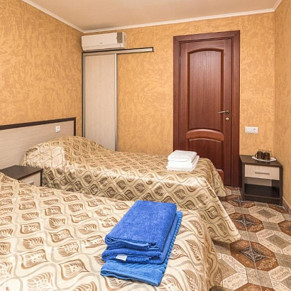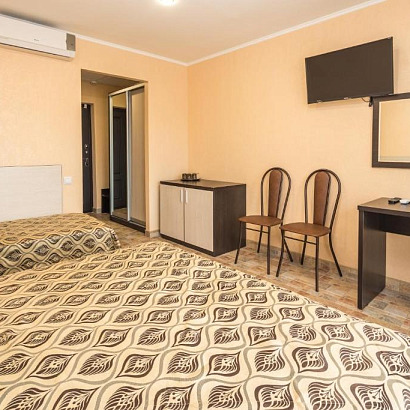 2-х местный "стандарт" с удобствами, без балкона: двуспальная кровать либо две односпальные кровати, тумбочки, шкаф для одежды, кондиционер, холодильник, телевизор, санузел с душем. По запросу устанавливается доп место (евро-раскладушка).