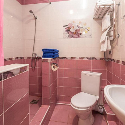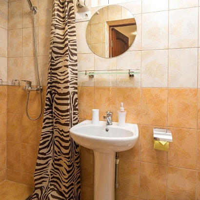 4-х местный "стандарт" с удобствами, без балкона: две односпальные кровати или двуспальная кровати, раскладной диван, тумбочки, шкаф для одежды, кондиционер, холодильник, телевизор, санузел с душем.