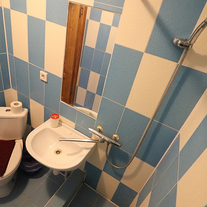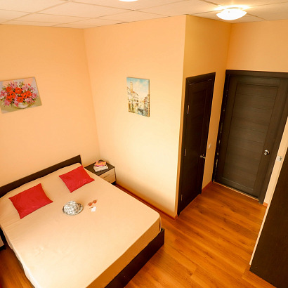 4-х местный 2-х комнатный номер с удобствами, ТВ, холодильником, кондиционером. Одна комната проходная. Номера оснащены: односпальные и двуспальные кровати, шкаф, прикроватные тумбочки.