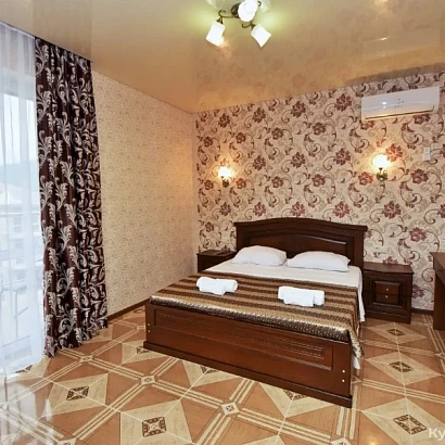 В номерах: двуспальная кровать, односпальная кровать, прикроватные тумбочки, туалетный столик, шкаф, гардеробная, холодильник, телевизор, сплит-система, электрочайник, на балконе стол и стулья. Санузел оборудован душем, туалетом, раковиной.