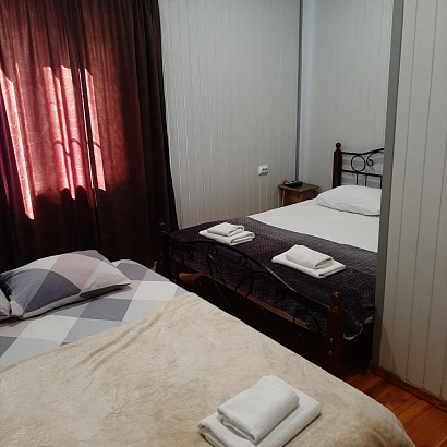 Номера: 3-х местные номера категории стандарт, со всеми удобствами, которые оснащены необходимой для проживания мебелью, телевизором, кондиционером, санузлом. В номере двуспальная и односпальная кровать.