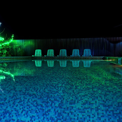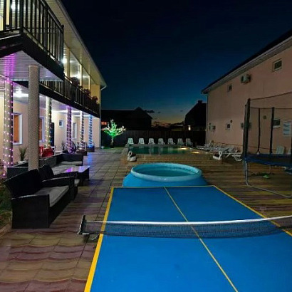 К услугам отдыхающих: большой благоустроенный двор оформленный растениями и цветами, альпийская горка с водопадом, подогреваемый бассейн (11 х 6 метров) для взрослых с шезлонгами и креслами для отдыха и надувной бассейн для детей, детская площадка, батут, качели, стол для тенниса, мангал (пользование может быть ограниченно в связи с действием Правил пожарной безопасности), бесплатный Wi-Fi на территории.