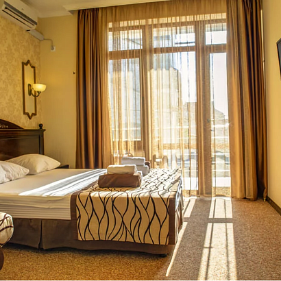 Пляж: галечный, в 200 метрах от гостиницы. ВНИМАНИЕ! В сезоне лето 2026 проводится реконструкция набережной! Предварительно участки доступные для купания: от Кара-Дага до Белого Грифона и от холма Юнге до Тихой бухты. Бесплатный трансфер до пляжа.