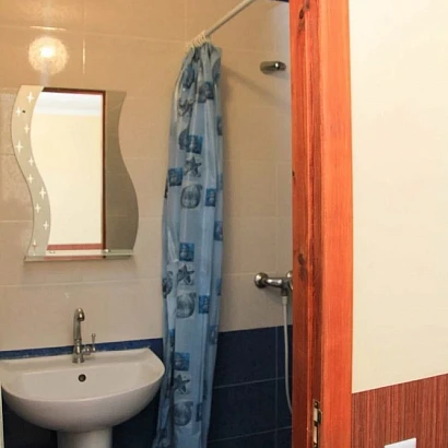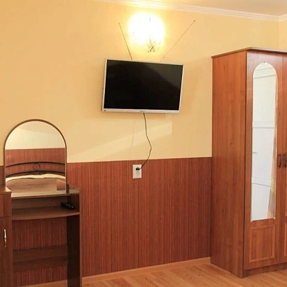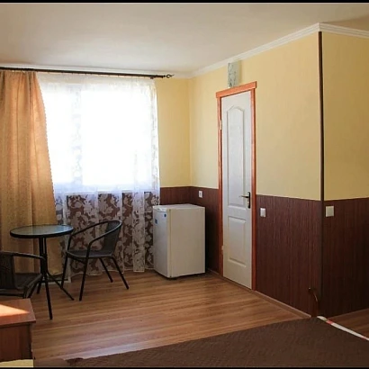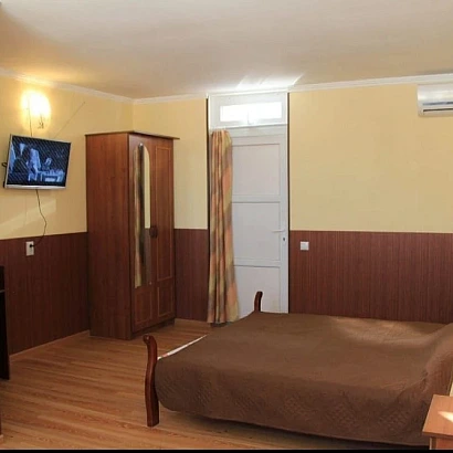 2-3-местные номера, в каждом из которых: одна двуспальная кровать (в 2-местном) или двуспальная и односпальные кровати (в 3-местном), необходимый набор мебели, санузел с душем, бесплатный Wi-Fi, кондиционер, холодильник, телевизор.