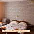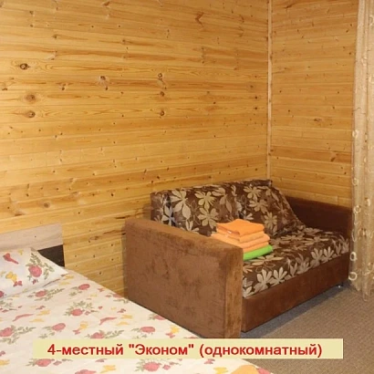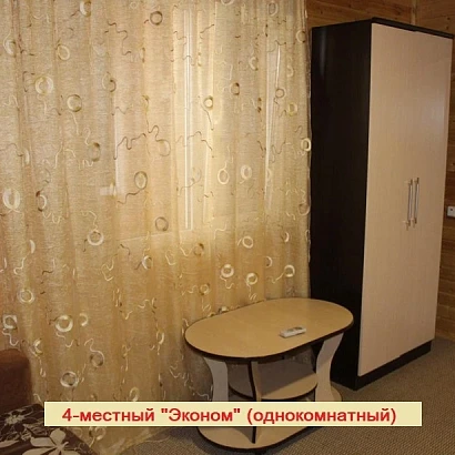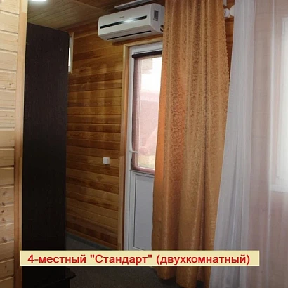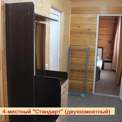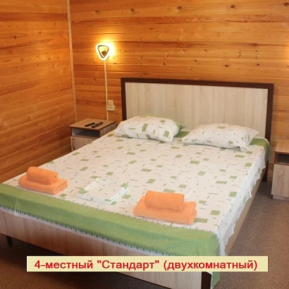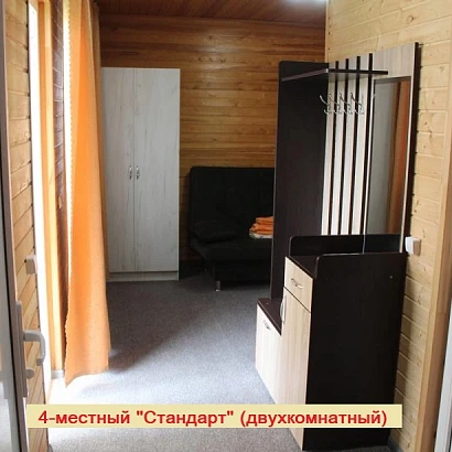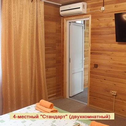 4-местный двухкомнатный номер на первом этаже (внутренняя отделка под дерево). Оснащение номера: двуспальная кровать, двуспальный раскладной диван, с прикроватными тумбами, консоль-прихожая, телевизор, холодильник, сплит-система, а также душевая комната (душ, унитаз, раковина).