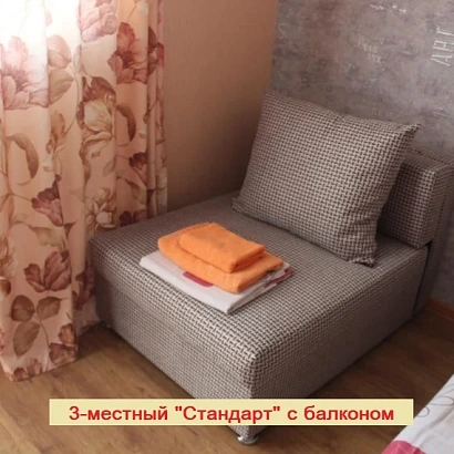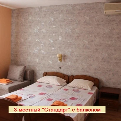 3-местный номер в корпусе на 2-м этаже С БАЛКОНОМ. Оснащение номера: 2 раздельные кровати и кресло-кровать (в качестве третьего спального места) с прикроватными тумбами, телевизор, холодильник, сплит-система, а также душевая комната (душ, унитаз, раковина), балкон.