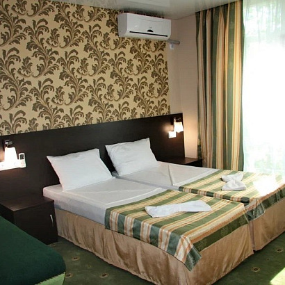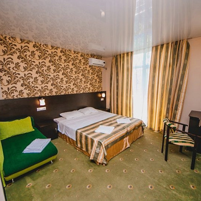 4-х местный номер с удобствами Комфорт (20 кв.м.): двуспальная или односпальная кровати, кресло-кровать и раскладной диванчик, шкаф, тумбочки, туалетный столик с зеркалом, кондиционер, телевизор, холодильник, санузел, душ, фен, французский балкон, карточные замки и система допуска, на полу ковролин. Номера расположены на 1-4 этажах.