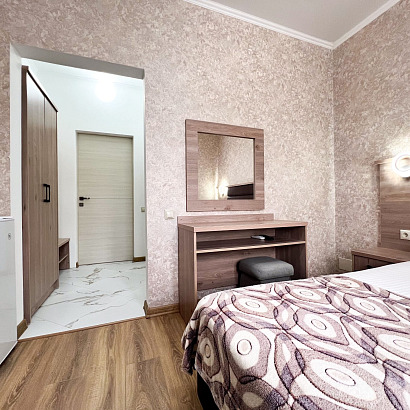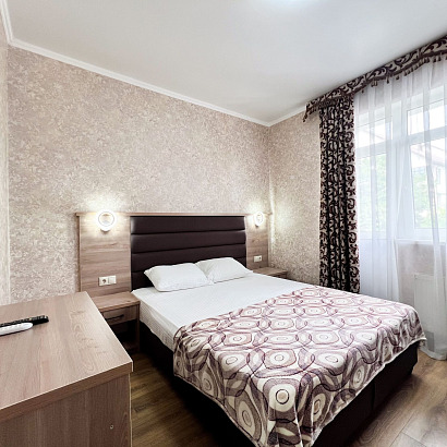 2-х местные номера "стандарт" с удобствами, ТВ, холодильник, кондиционер, фен. Обородуваны односпальными или двуспальной кроватями, шкаф, стулья, прикроватные тумбочки, журнальный столик, стол, прихожая, вешалка, зеркало, на балконе уличная мебель. Доп место - раскладной диванчик.