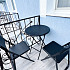 3-х местные номера "комфорт" с удобствами, ТВ, холодильник, укондиционер, фен. Обородуваны односпальной и двуспальной кроватями, шкаф, стулья, прикроватные тумбочки, журнальный столик, стол, прихожая, вешалка, зеркало, на балконе уличная мебель. Доп места нет. Номер большей площадью.