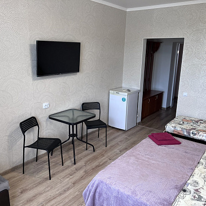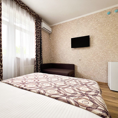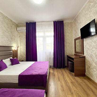 3-х местные номера "стандарт" с удобствами, ТВ, холодильник, укондиционер, фен. Обородуваны односпальной и двуспальной кроватями, шкаф, стулья, прикроватные тумбочки, журнальный столик, стол, прихожая, вешалка, зеркало, на балконе уличная мебель. Доп места нет.