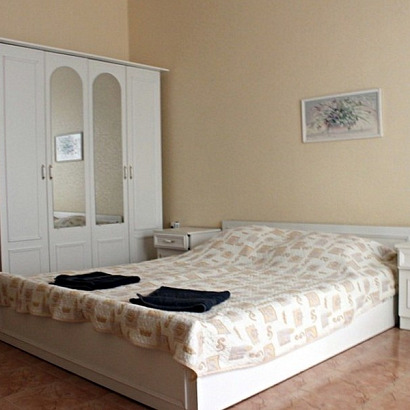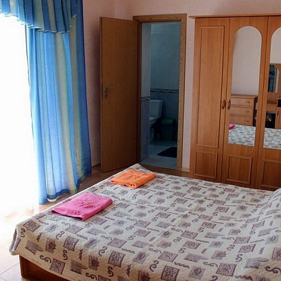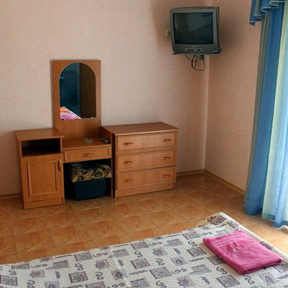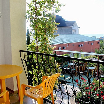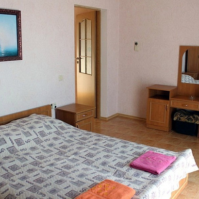 4-х местные номера со всеми удобствами: две проходные комнаты, двуспальная кровать, диван-кровать, шкаф, тумбочки, стол, стулья, туалетный столик, обеденный стол, электрочайник, посуда, сейф, телевизор, холодильник, кондиционер, санузел, балкон с видом на море.