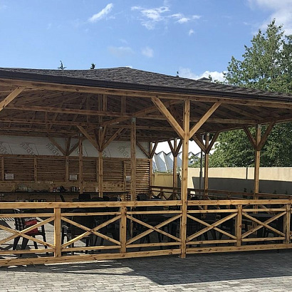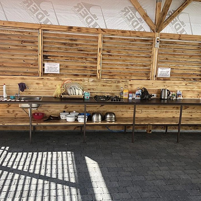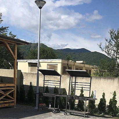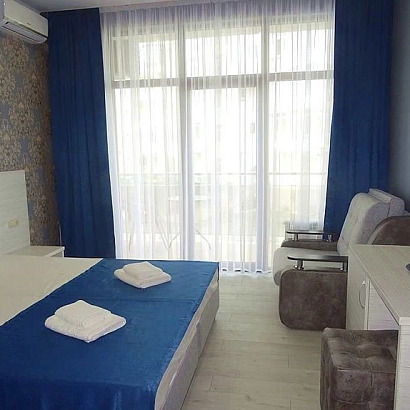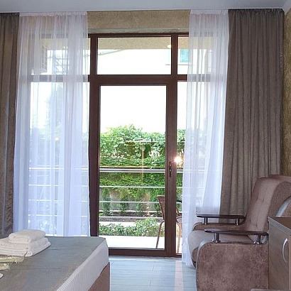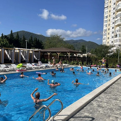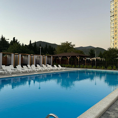 Инфраструктура: Wi-Fi, большой бассейн (20м*8м) с детским отделением, с подогревом и лежаками, ухоженный большой двор, летняя кухня, мангал, гладильная доска на каждом этаже, мангал, стирка (платно), парковка. Детской площадки нет! Детская анимация 2 раза в неделю.