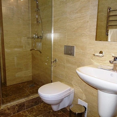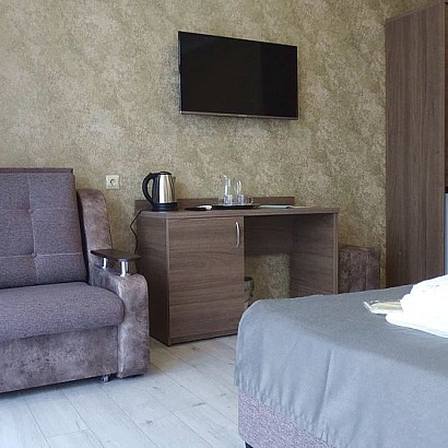 2-х местный номер с удобствами, без балкона, расположены частично на 1 этаже. Оснащен: двуспальная или односпальные кровати, шкаф, тумбочки, телевизор, сейф, чайник, кондиционер, санузел, душ, фен.