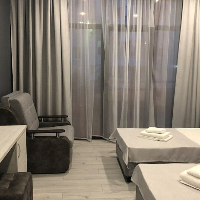 4-х местный номер с удобствами, с балконом. Оснащен: двуспальная и/или односпальные кровати, 2-х местный раскладной диван или два кресла-кровати, шкаф, тумбочки, телевизор, сейф, чайник, кондиционер, холодильник, санузел, душ, фен.