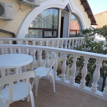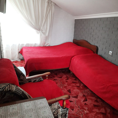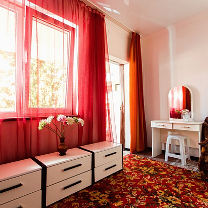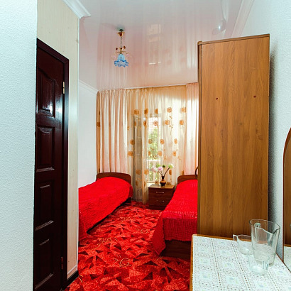 3-х местный номер с удобствами Стандарт: двуспальная и односпальная кровати, шкаф, тумбочки, туалетный столик, кондиционер, телевизор, холодильник (в номере или на два номера), санузел, душ, терасса. Расположен на 1-ом этаже, рядом с номером стол и стулья для отдыха.