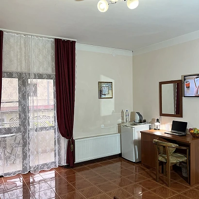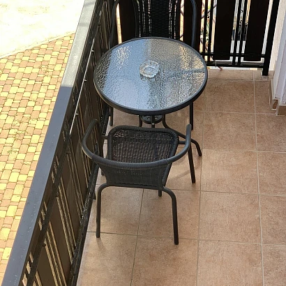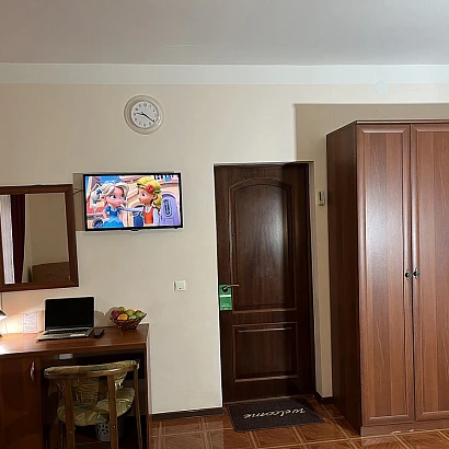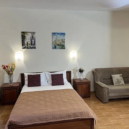 3-местный номер на втором этаже с балконом. В номере: совмещенный санузел, 2-спальная кровать + диван, необходимая мебель, холодильник, кондиционер, электрочайник, набор посуды, сушилка для одежды, фен.
