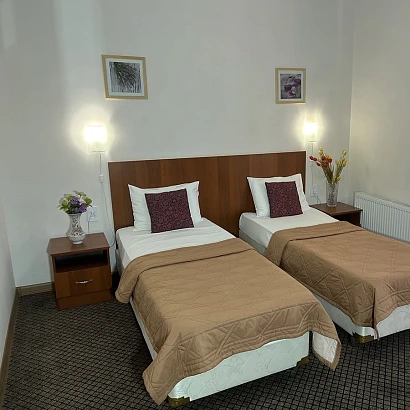 2-местный комфортные номер (на мансарде 4 этаж). В номере: санузел совмещенный, раздельные кровати, необходимая мебель, холодильник, телевизор, кондиционер, электрочайник, набор посуды, сушилка для одежды, фен.