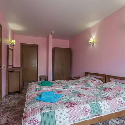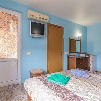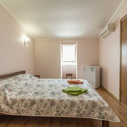 2-х местный с удобствами, с балконом: двуспальная кровать либо две односпальные кровати, тумбочки, шкаф для одежды, комод с зеркалом, (стол со стульями на балконе), кондиционер, холодильник, телевизор, санузел с душем.