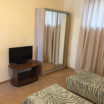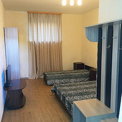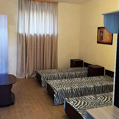 3-х местный стандартный номер с удобствами: двуспальная и/или односпальные кровати, шкаф, стулья, прикроватные тумбочки, журнальный столик, вешалка, зеркало, посуда, кондиционер, холодильник, телевизор, спутниковое ТВ, санузел, душ. Доп.место еврораскладушка.