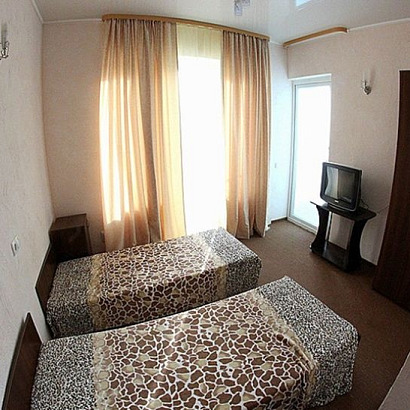 2-х местный стандартный номер с удобствами: двуспальные кровати, шкаф, стулья, прикроватные тумбочки, журнальный столик, вешалка, зеркало, посуда, кондиционер, холодильник, телевизор, спутниковое ТВ, санузел, душ.