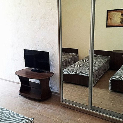 4-х местные 2-х комнатные апартаменты с удобствами, телевизором, холодильником, кондиционером, сейфом, микроволновкой и чайником. Общая площадь 60 кв.м. В номере двуспальная кровать 1,6м*1,9м, прикроватные тумбочки, шкаф, раскладной диван с размером спального места 1,6м*1,9м. Есть возможность установить два доп места.