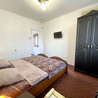 4-х местный 2-х комнатный люкс с террасой: комфортный номер с большим балконом с видом на двор для 2-6 чел. (столик с стульями, сушилка для белья), ванная, санузел. В 1 комнате: двуспальная кровать, евро-диван (100х190), прикроватные тумбы, шкаф с зеркалом, ТВ, сплит-система, сейф. Во 2 комнате: угловой мягкий диван (140х190), холодильник, ТВ, комод, журнальный столик, сплит-система.