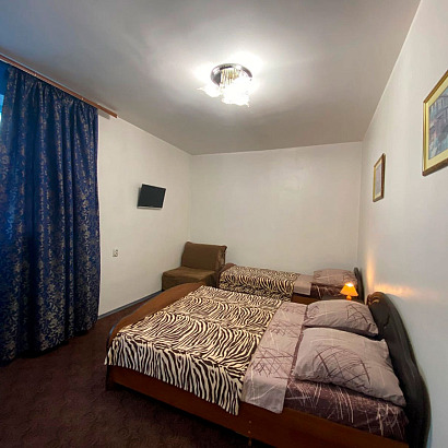 3-х местный полулюкс 3 этаж: простой, комфортный номер с балконом. Возможно дополнительное место. В номере двуспальная и односпальная кровати, кресло-кровать, прикроватные тумбочки, шкаф для одежды, телевизор, кондиционер, холодильник, сейф.