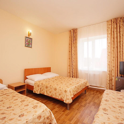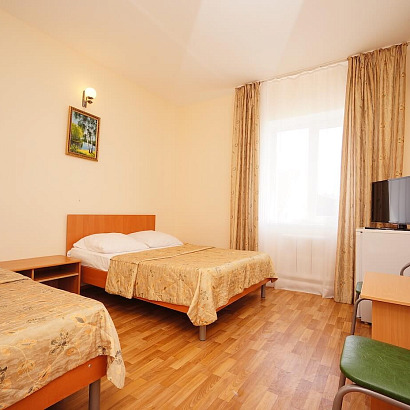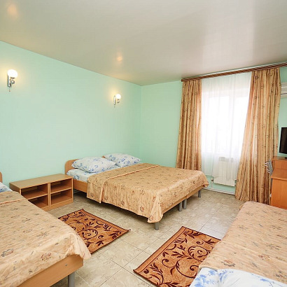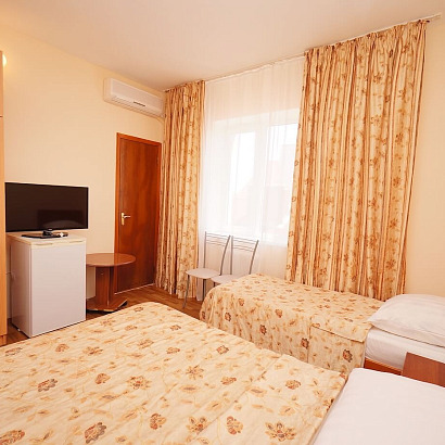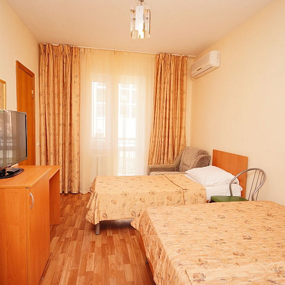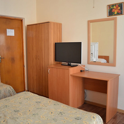 2-3-4-х местные однокомнатные номера с удобствами, ТВ, холодильником, кондиционером. Есть номера с балконом и без балкона. В номерах: кровати, прикроватные тумбочки, шкаф для одежды, журнальный столик, туалетный столик с зеркалом, стул.