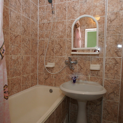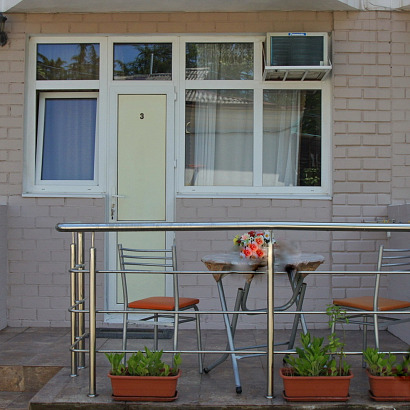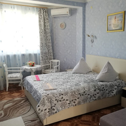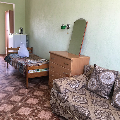3-х местный номер с удобствами: двуспальная кровать, кресло-кровать, комод, стол, тумбочка, чайник, телевизор, холодильник, кондиционер, санузел и душ раздельно.