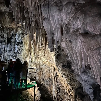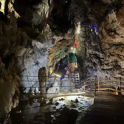 Посещение «Большая Азишская» пещера - посещение одной из самых красивых и интересных пещер северного склона Западного Кавказа, впервые исследованной в 1910г. Пещера состоит из нескольких крупных залов со множеством сталактитов, сталагмитов и натечных форм. Общая длина пещеры 690м, глубина 37м. В 1973 г. Азишская пещера была объявлена памятником природы. Главное богатство этого подземного царства — сталактиты и сталагмиты, которых здесь огромное количество. Предполагают, что возраст пещеры составляет более 2 000 000 лет. В этом можно убедиться наглядно, ведь представленные «экспонаты» растут со скоростью 1 см в 100 лет, а некоторые из них довольно внушительных размеров.Также рекомендуют одеться потеплее, так как даже в жаркое время года температура внутри держится на отметке +6,3 °C.