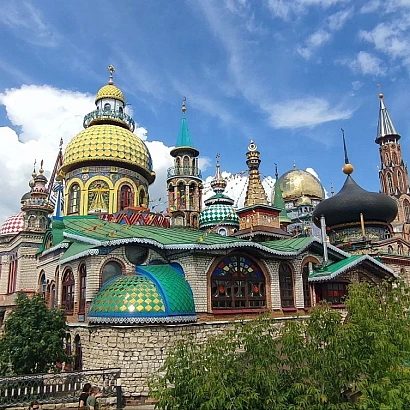 Внешний осмотр «ХРАМ ВСЕХ РЕЛИГИЙ» (ВСЕЛЕНСКИЙ ХРАМ) – уникальное архитектурное здание, объединившее в себе черты католических, православных и буддистских храмов, мечети и синагоги. Службы в нем не ведутся, это архитектурный символический симбиоз религий, цивилизаций и культур всего человечества. Внутри имеет несколько декорированных залов, каждый из которых посвящен различным верованиям: зал Будды, Египетский зал, Католический зал, зал Иисуса Христа.