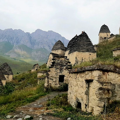 Переезд через Какадурский перевал, связывающий Куртатинскую и Даргавскую котловины, в Гизельдонское ущелье. Проедем вдоль южных склонов Скалистого хребта, с изгибами и крутыми поворотами и попадем в Даргавскую котловину Кобанского ущелья, где находится "Осетинская Долина Фараонов" - Даргавский некрополь в народе его сравнивают с египетской "Долиной Фараонов". По живописным горным склонам рассыпался целый "город" из, более чем, 90 склеповых сооружений оригинальной формы в виде белых каменных башенок-домиков с необычными крышами. Покой "Осетинской долины Фараонов" охраняют величественные Сторожевые башни XVI-XVII вв.